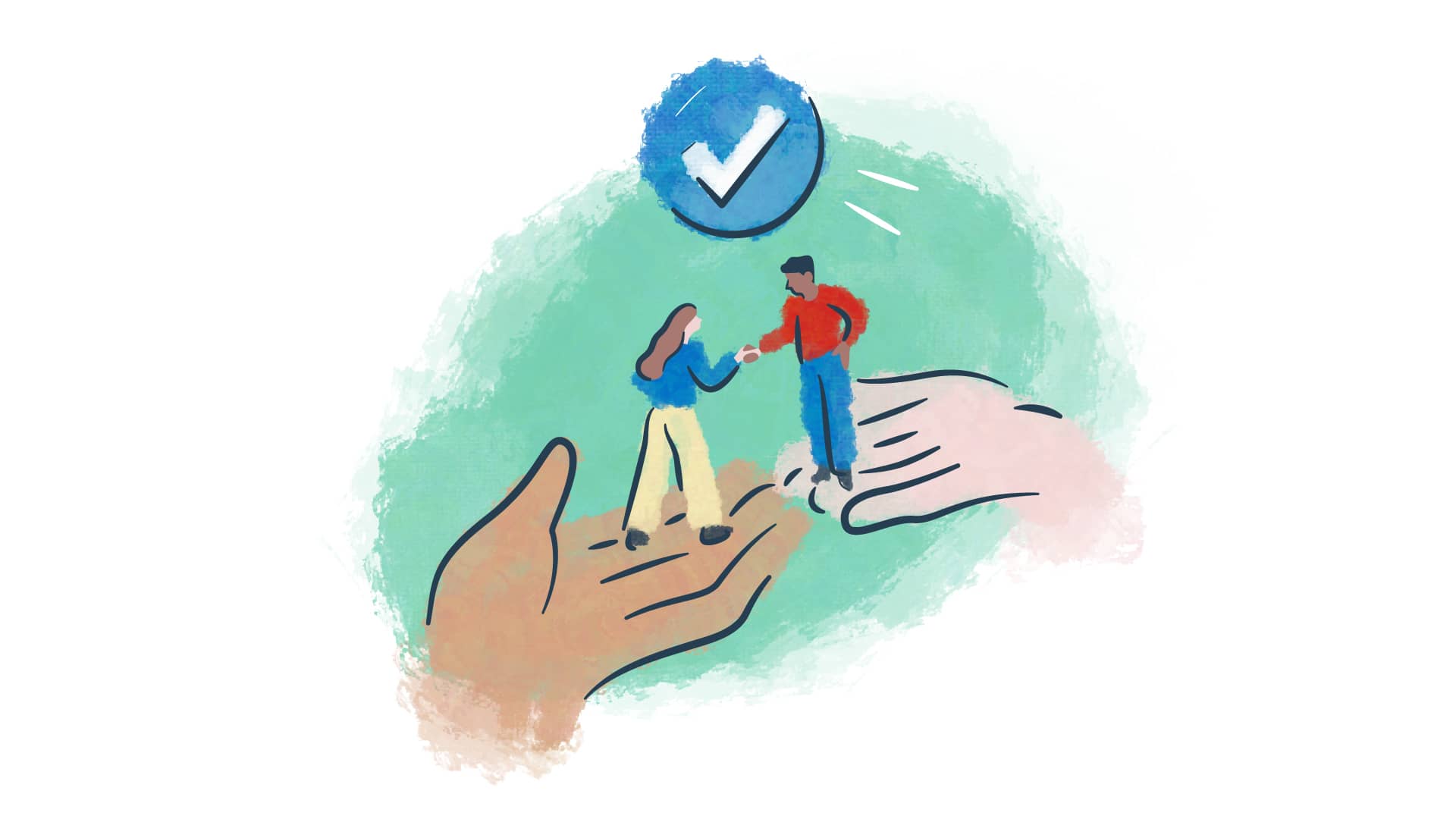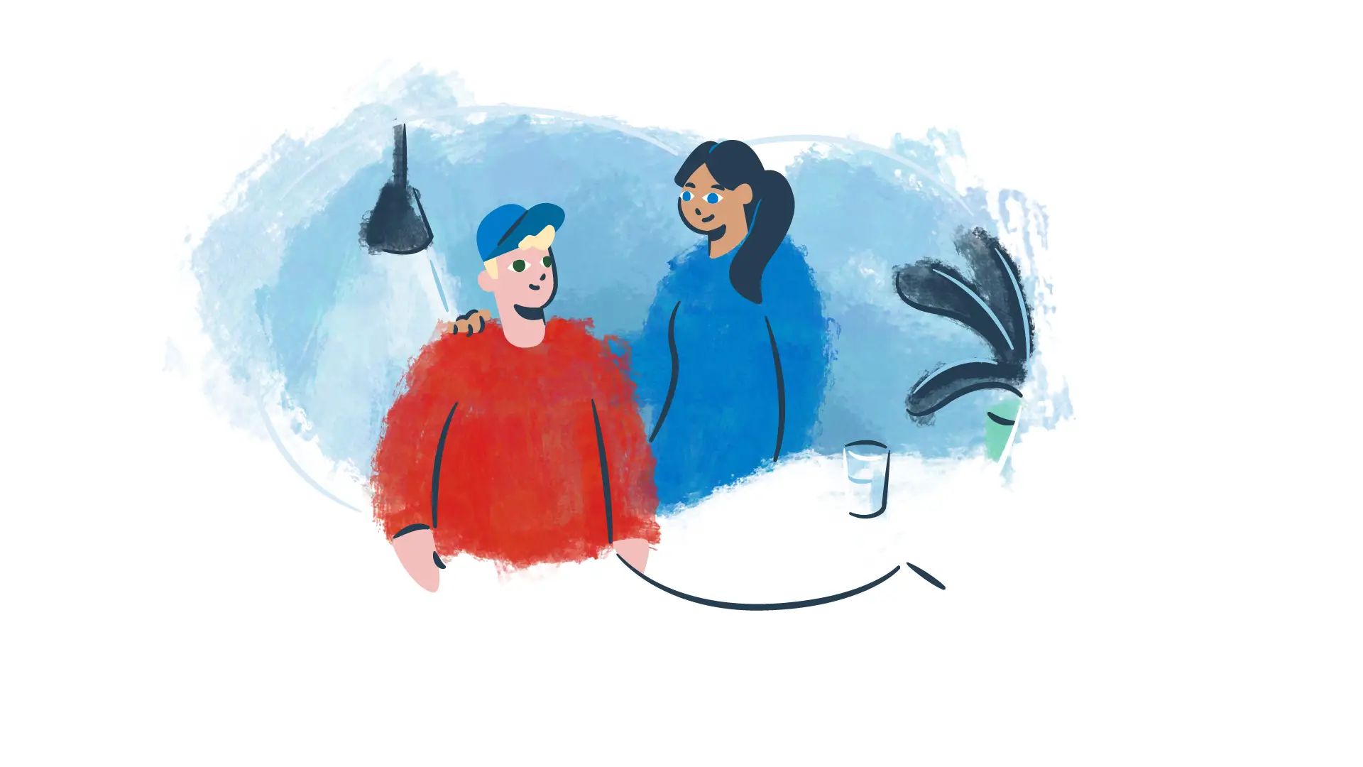 (Er verschijnt een illustratie in beeld van twee volwassenen die allebei een arm om een kind slaan. Samen kijken ze naar de zonsondergang.)